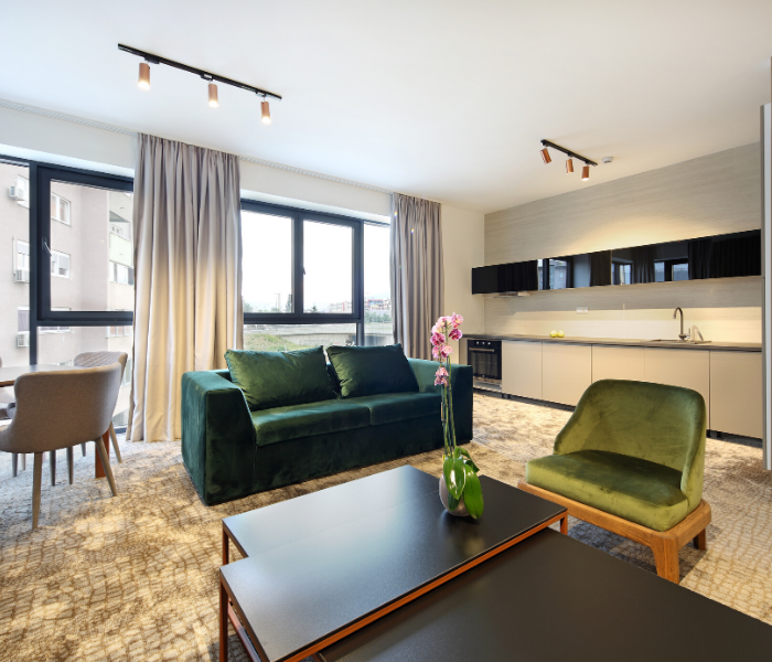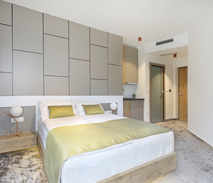 Hotel raspolaže sa 55 moderno opremljenih soba I apartmana sa kuhinjom,